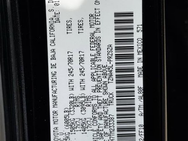 Carpeted Floor Mats|JBL Premium Audio|Fabric Seat Trim|Spray-on Bed Liner|Wheels: 17"" Styled Alloy|3.583 Axle Ratio|Radio: 8"" Toyota Audio Multimedia|4-Wheel Disc Brakes|Emergency communication system: Safety Connect (up to 10-year trial subscription)|Apple CarPlay/Android Auto|Auto High-beam Headlights|Exterior Parking Camera Rear|AM/FM radio: SiriusXM|Auto-dimming Rear-View mirror|Front beverage holders|Variably intermittent wipers|Trip computer|Traction control|Tilt steering wheel|Telescoping steering wheel|Steering wheel mounted audio controls|Split folding rear seat|Speed-sensing steering|Speed control|Remote keyless entry|Rear window defroster|Rear step bumper|Power windows|Power steering|Power door mirrors|Passenger door bin|Panic alarm|Overhead console|Overhead airbag|Outside temperature display|Occupant sensing airbag|Low tire pressure warning|Knee airbag|Illuminated entry|Heated door mirrors|Fully automatic headlights|Front reading lights|Front fog lights|Front anti-roll bar|Four wheel independent suspension|Dual front side impact airbags|Dual front impact airbags|Driver door bin|Bumpers: body-color|Brake assist|Anti-whiplash front head restraints|Alloy wheels|ABS brakes|Tachometer|Front Center Armrest|Front Bucket Seats|Electronic Stability Control|Air Conditioning|6 Speakers